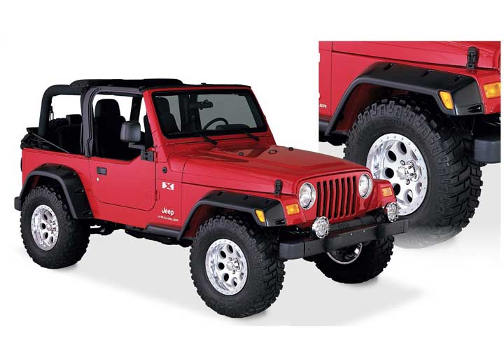 Tired of the same style fender flares that everyone else has? Then these new Bushwacker Pocket style flares are for you! Keep your Jeep legal and protect your paint job at the same time. Provides 6 of tire coverage. Made of Dura-Flex 2000 for maximum durability and flexibility. 100% UV protected-no chalking, cracking or warping. Easy to paint. Flares come with button head self-tapping stainless torque screws that install in existing holes for a fast NO DRILL installation. Original hardware can be reused.